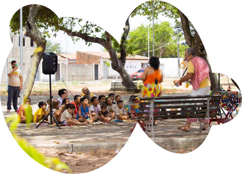 Em concomitância a criação do experimento teatral foi realizada uma residência artístico-pedagógica no bairro de Felipe Camarão em Natal/RN em parceria com o Coletivo A Gente, formado por jovens daquele território, que durante os anos de 2023 e 2024 teve um polo de atuação voltado para as crianças e seus familiares através da ocupação artística que se deu na praça Santa Paula Franssinete, onde a sala de aula era a praça e as árvores eram as professoras e contadoras de histórias (Foto 2 e 3).